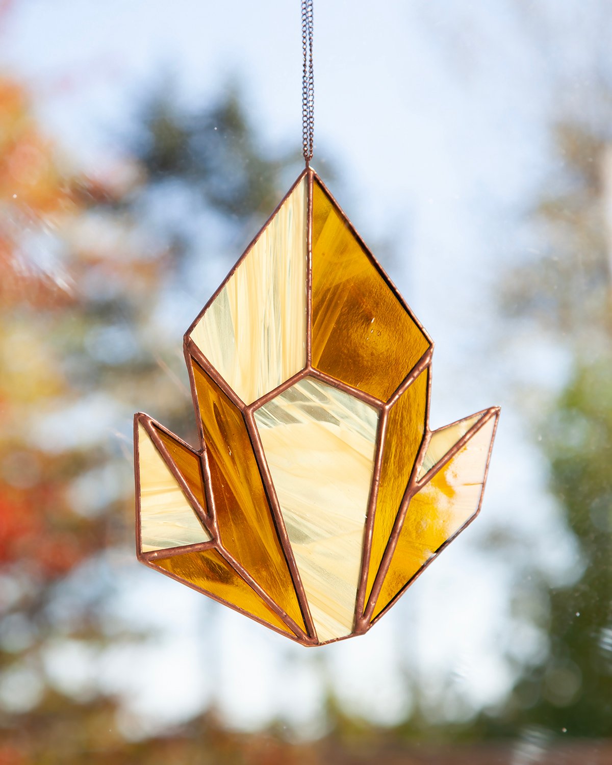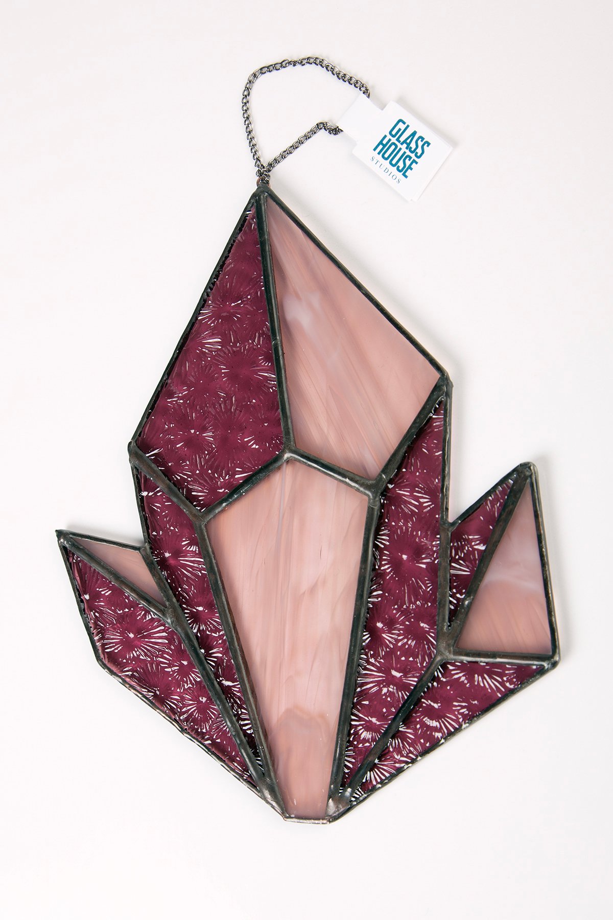 These stained glass Crystal Clusters are truly unique! You can choose the colour of glass you would like (ex: Blue) and I will send you images of the glass I have available in that colour. You get to design your own! Or if you prefer, I can choose for you. These crystals are perfect to hang in a window and they look great with the sunlight coming through the glass. It can also be displayed on the wall.